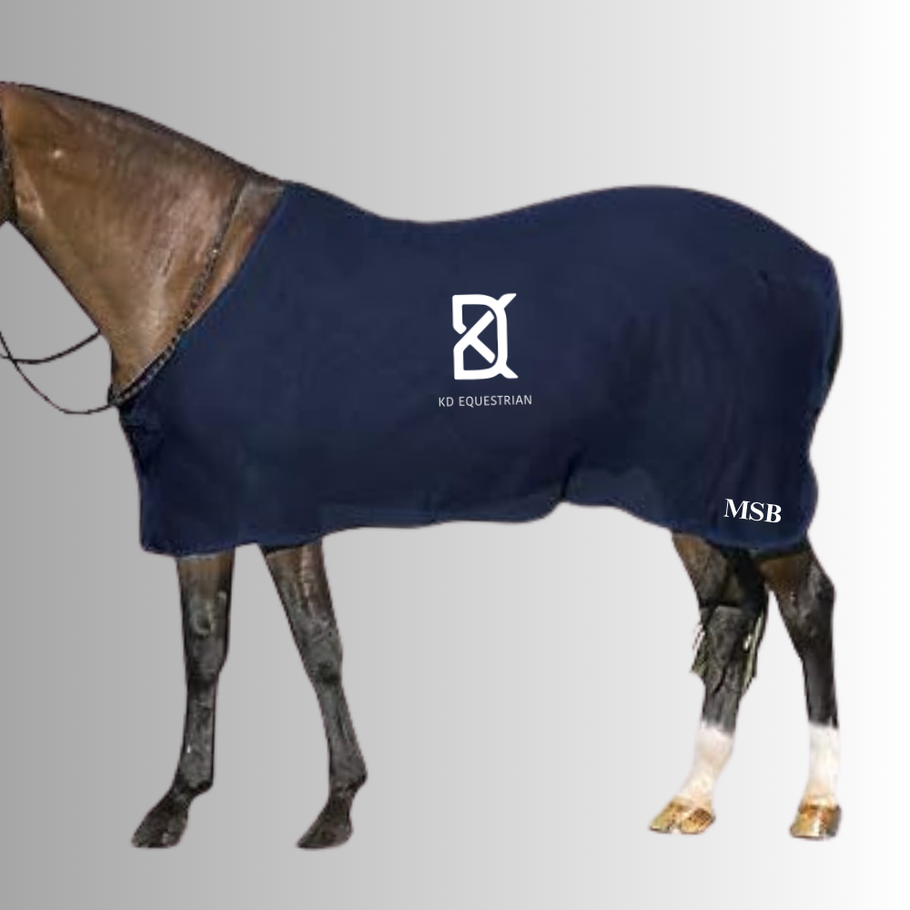 This scrim is made by Centaur and is navy with navy trim. Embroidered with the KD Equestrian logo on the left side barrel, and your initials at left hip.