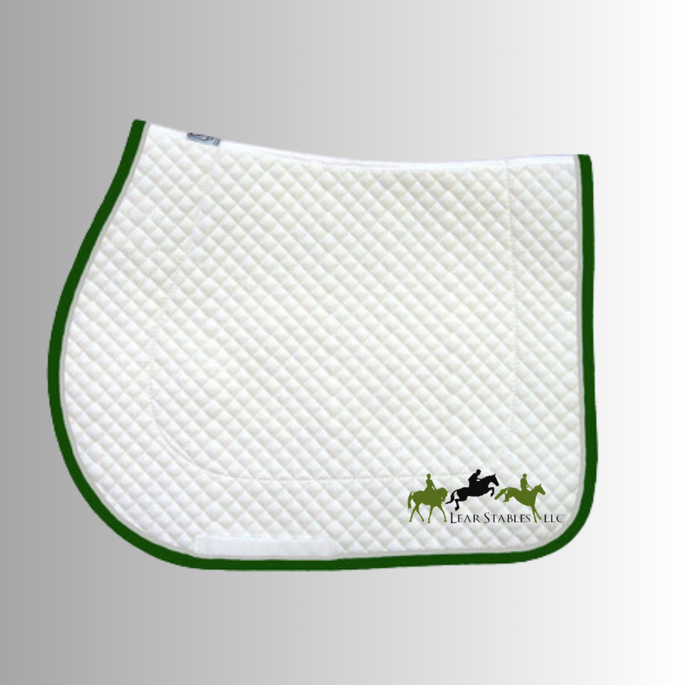 This pad is Wilkers Style 19BC, beautifully soft and well made, with custom Lear Stables trim, piping, and logo embroidered on both sides.