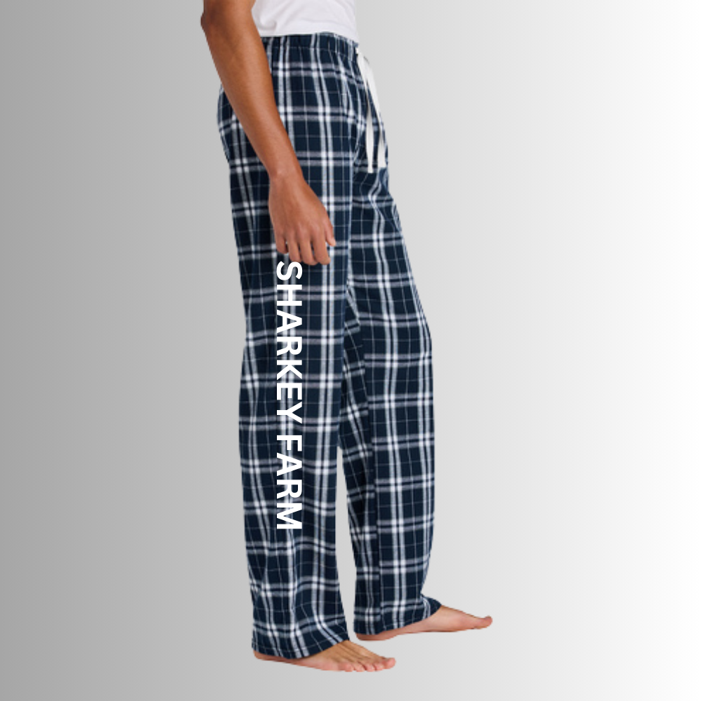 Comfy flannel pants great for lounging around or covering your breeches at shows. Sharkey Farm (digital heat transfer) down the right leg. White text on red pants, red text on black pants.